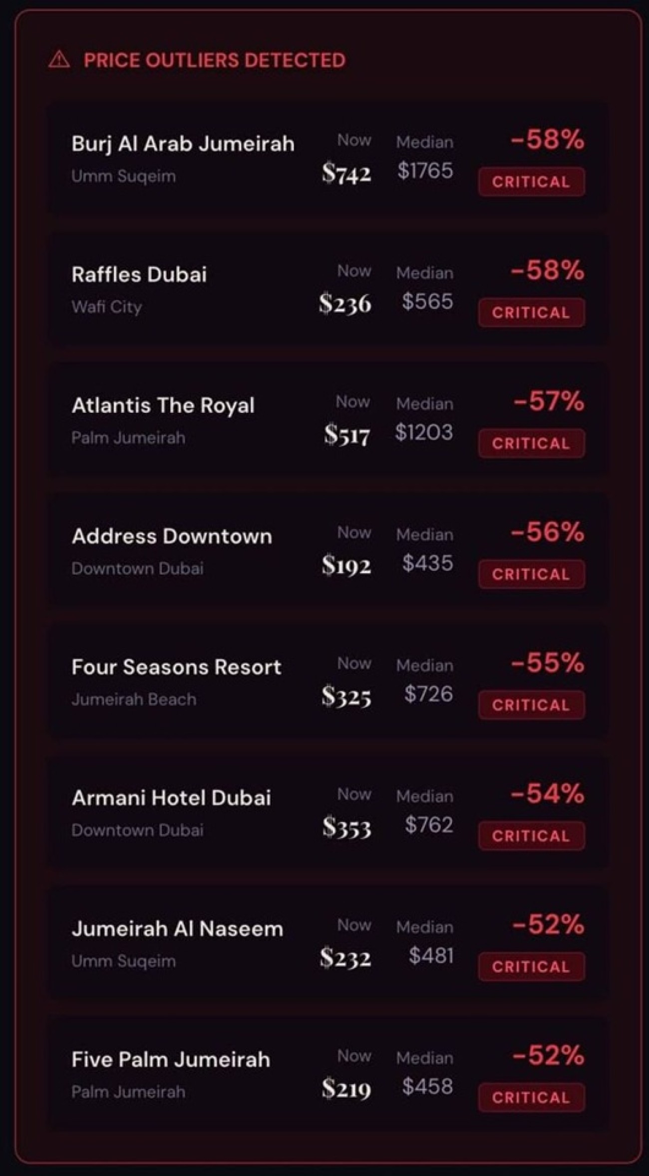Дубай – әлемдегі ең танымал туристік бағыттардың бірі. Люксов қонақүйлер сегменті қаланың негізгі табыс көздерінің бірі саналады. Бағаның 60%-ға дейін төмендеуі сұраныстың күрт азайғанын көрсетеді.