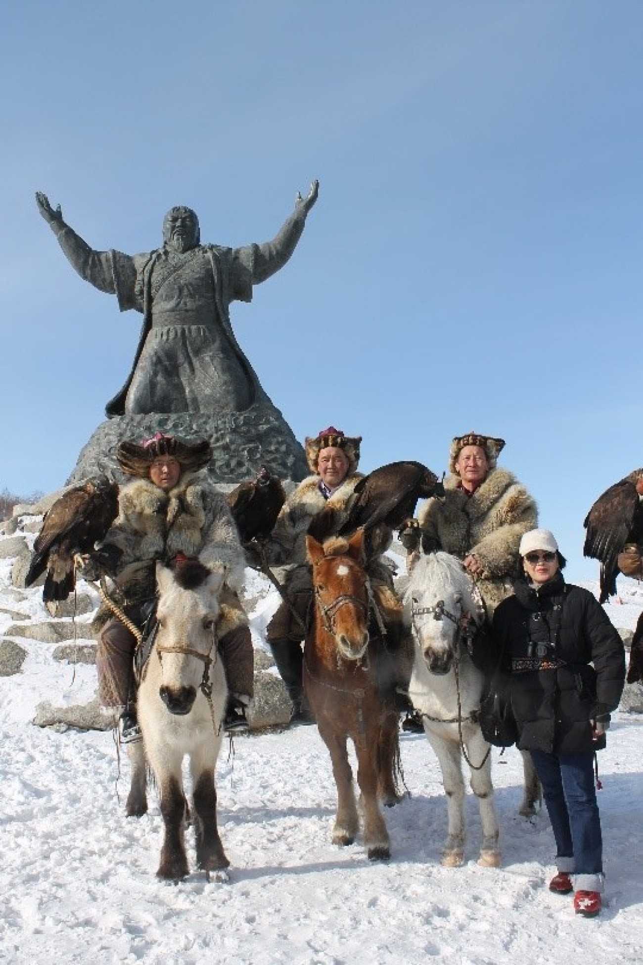 Ертеңгісін таң қылаң бере сыртқа шыққанда айналаны аппақ қар жапқан тыныш дала қарсы алды. Кешен тау етегінде екен. Сол таудың етегіндегі көзге шалынып тұрған алып мүсін бар: қолын көкке көтерген тұлға – Шыңғысхан бейнесі. Көптен таныс тарихи образ осы дала кеңістігімен астасқан, өзгеше.