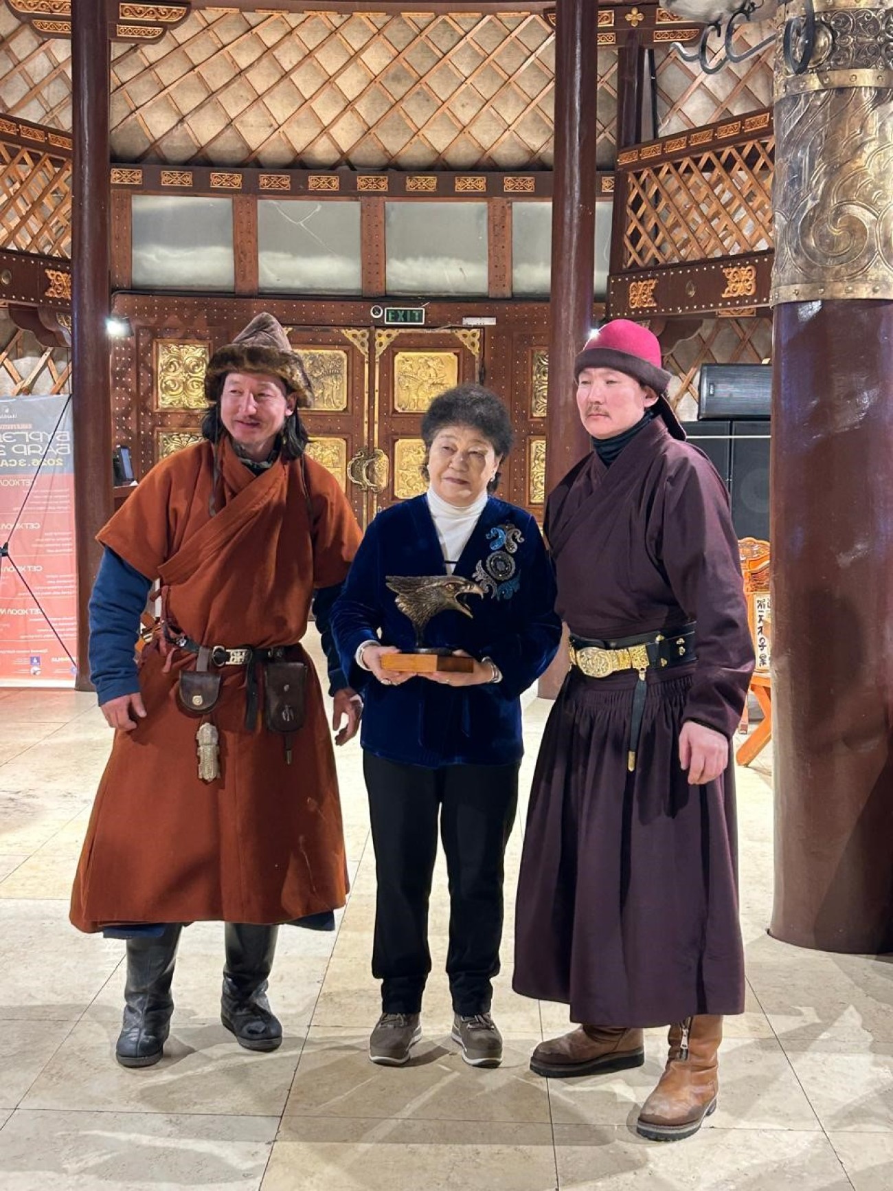 Моңғол Саятшылар қауымдастығының жетекшілерінің сыйы – қыран мүсіні. Сол жақтағы фотода астаналық туризм департаментінің директоры Д.Батсүх пен қазақстандық бас бапкер Базарбек Күнтуғанұлы