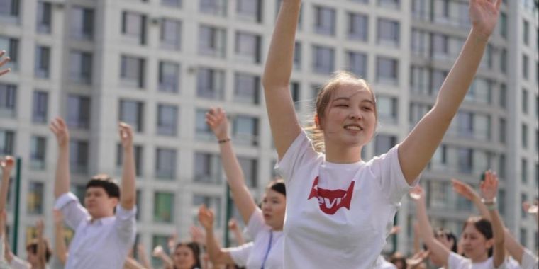 Бірыңғай флешмоб барысында оқушылар тазалық пен салауатты өмір салтын дәріптейтін түрлі спорттық би қойылымдарын қойып, ұжымдық әрекеттер ұйымдастырды.