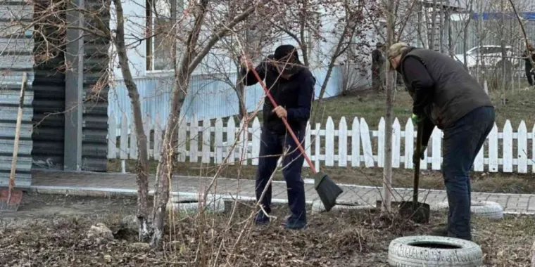 Өндіріс аумағындағы қураған шөп пен жапырақтан тазартылды, тал, теректің түбі әктеліп, топырағы қопсытылды.